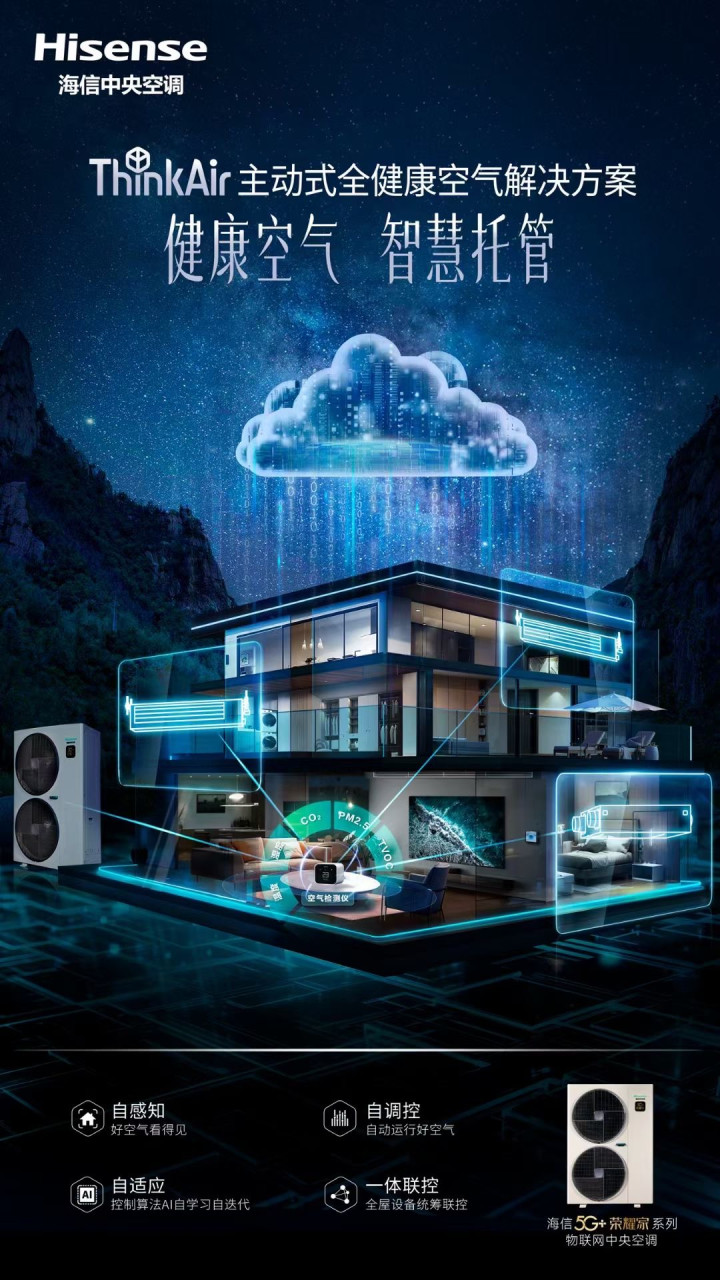 当空调遇上5G和AI,会发生怎样的化学反应?海信中央空调最新推出的“5G+荣耀家系列”,给出了答案。这款产品不仅是温控设备,更是一套**“ThinkAir主动式全健康空气解决方案”**,通过**自感知、自调控、自适应**三大核心能力,让空气管理彻底告别手动时代。